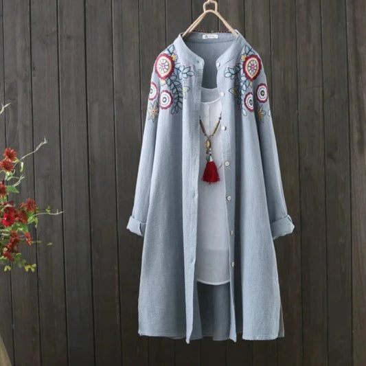 Timeless Style: Woman's Floral Embroidered Long Cotton Shirt