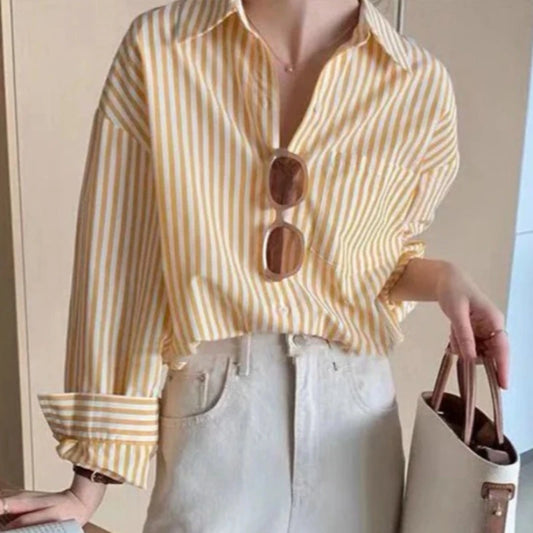 Minimalist Chic: Striped Long Sleeve Shirt With Pocket (Women's)