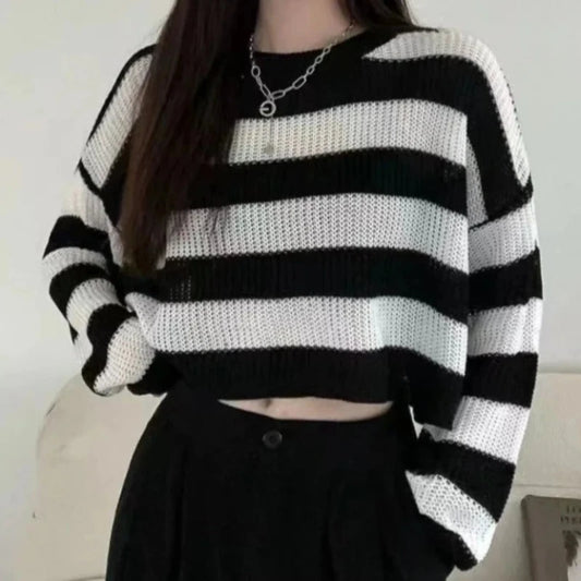 Streetwear Vibes: Oversized Cropped Striped Knit Sweater For Her
