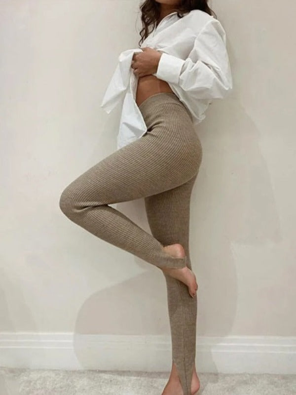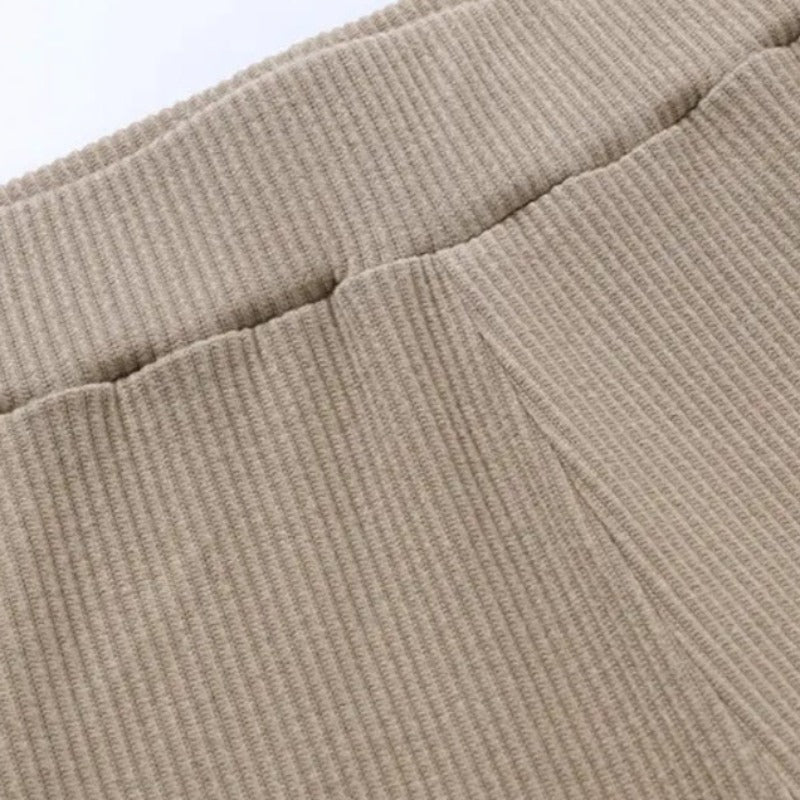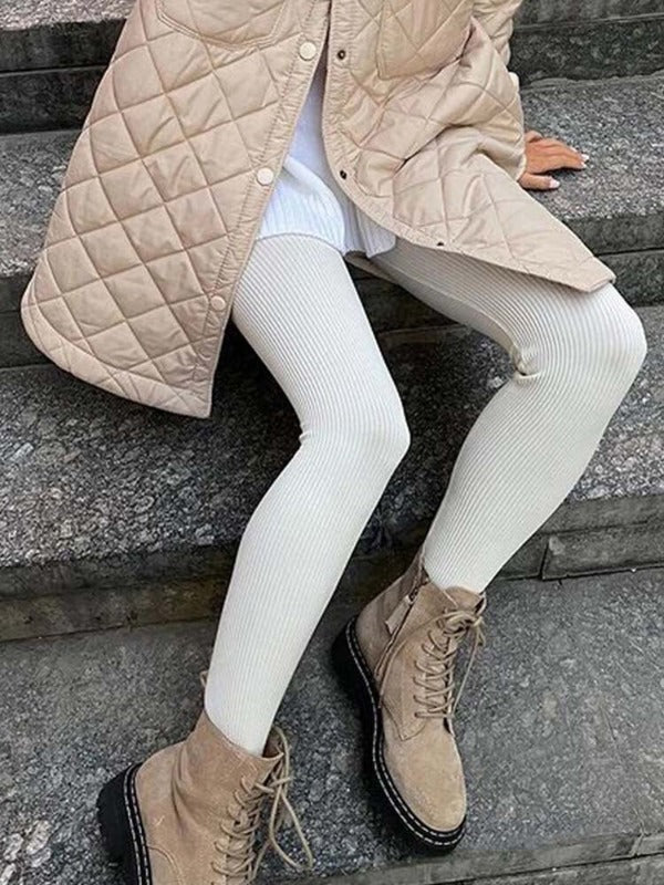 - Flattering Fit: High-waisted silhouette and ribbed texture elongate and define your shape.